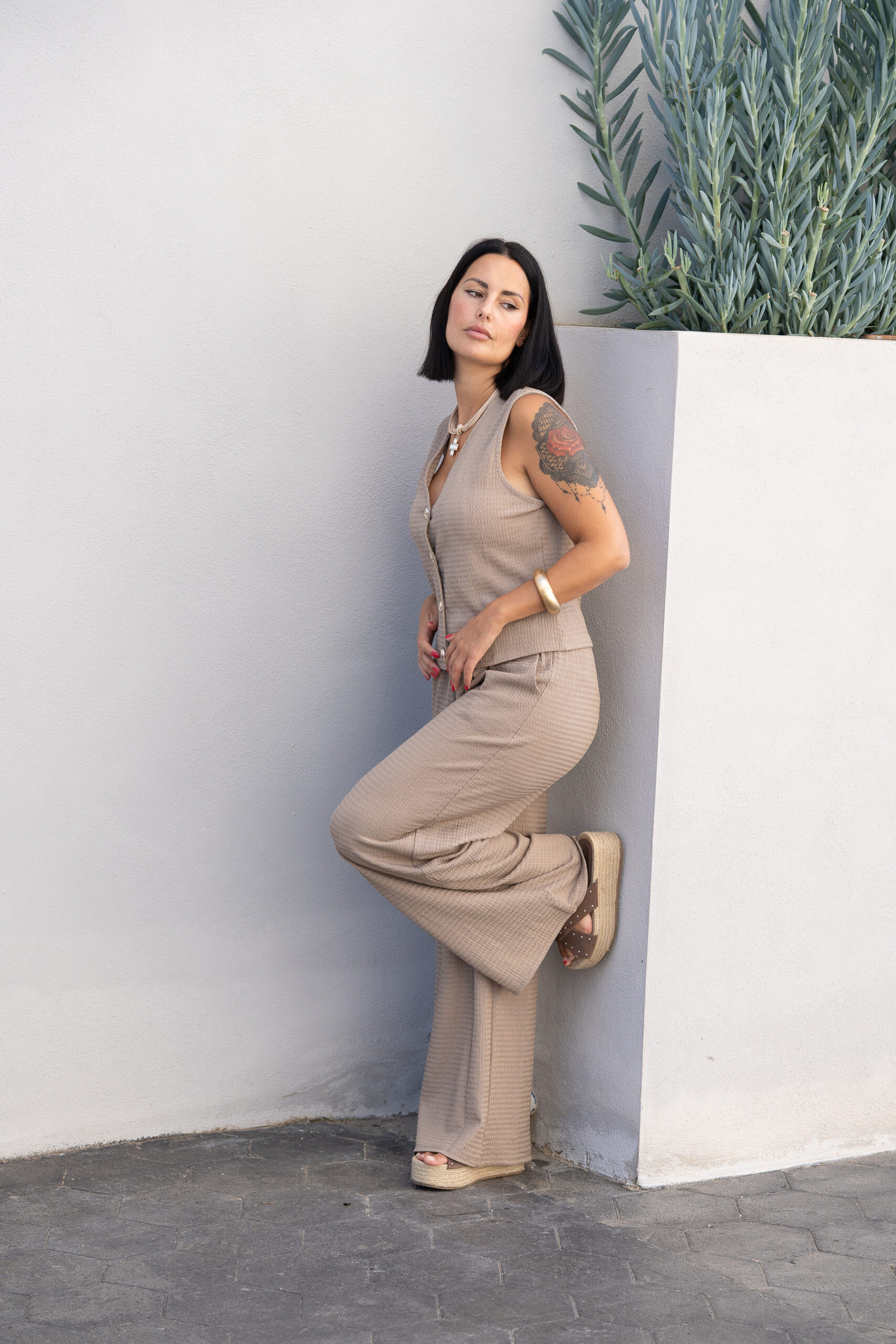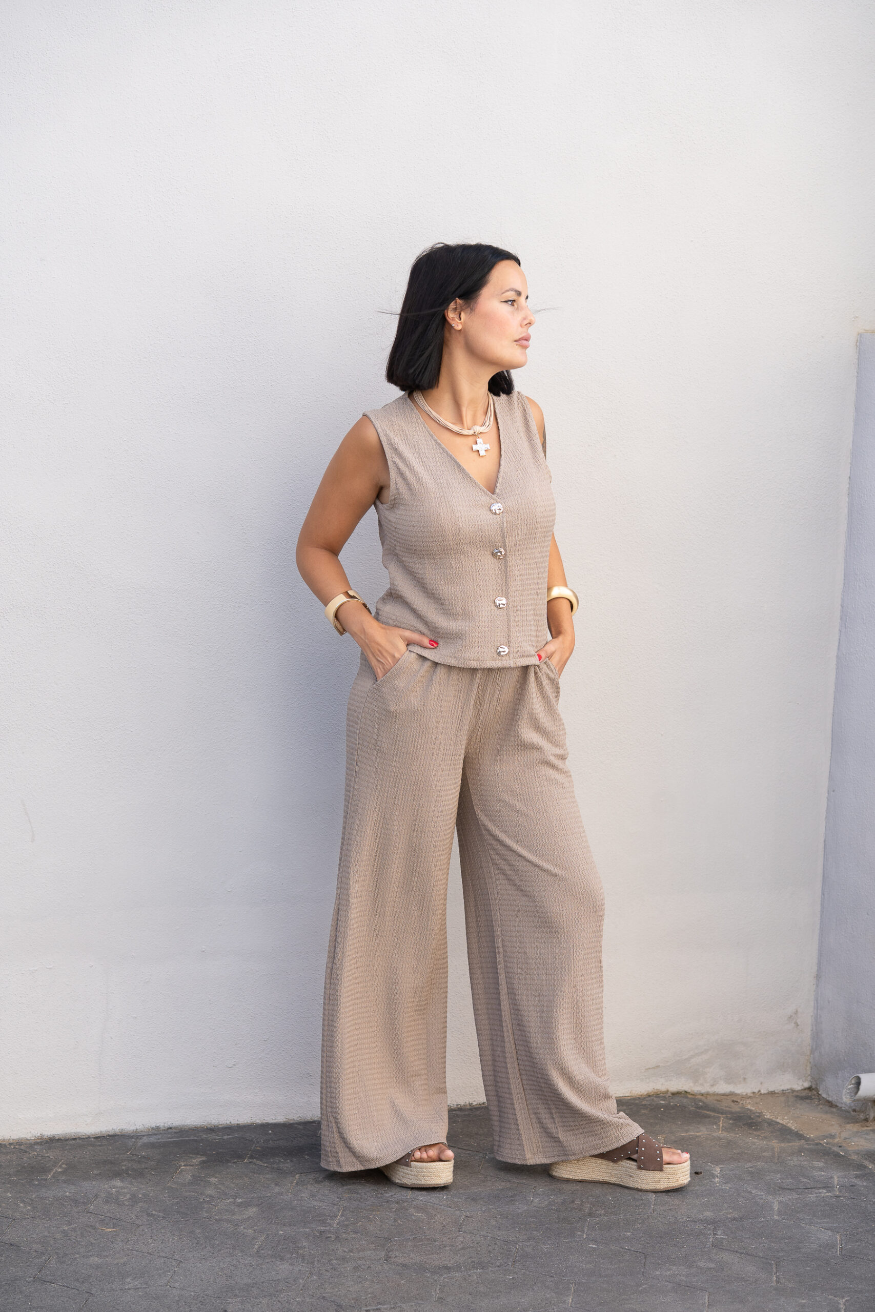 Tejido textura fluido. Escote pico. Manga sisa. Cierre frontal botones. Pantalón de tiro alto. Cintura elástica. Bolsillos laterales. Pernera recta.